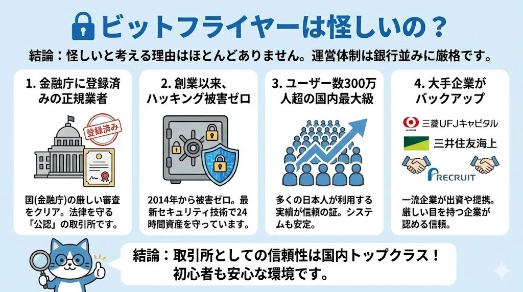 仮想通貨取引所を選ぶ際に、多くの人が気にするのが「安全性」や「怪しくないか」という点です。ビットフライヤーは国内でもトップクラスの取引所として長年運営されており、信頼性の面で高い評価を得ています。具体的なポイントを整理しました。