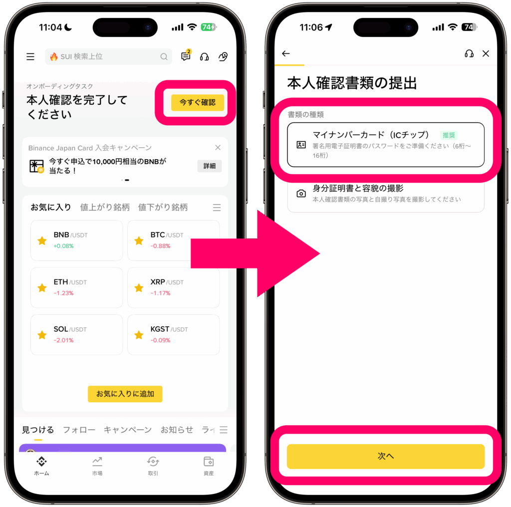 アプリのホーム画面に表示される「本人確認を完了してください(今すぐ確認)」をタップします。