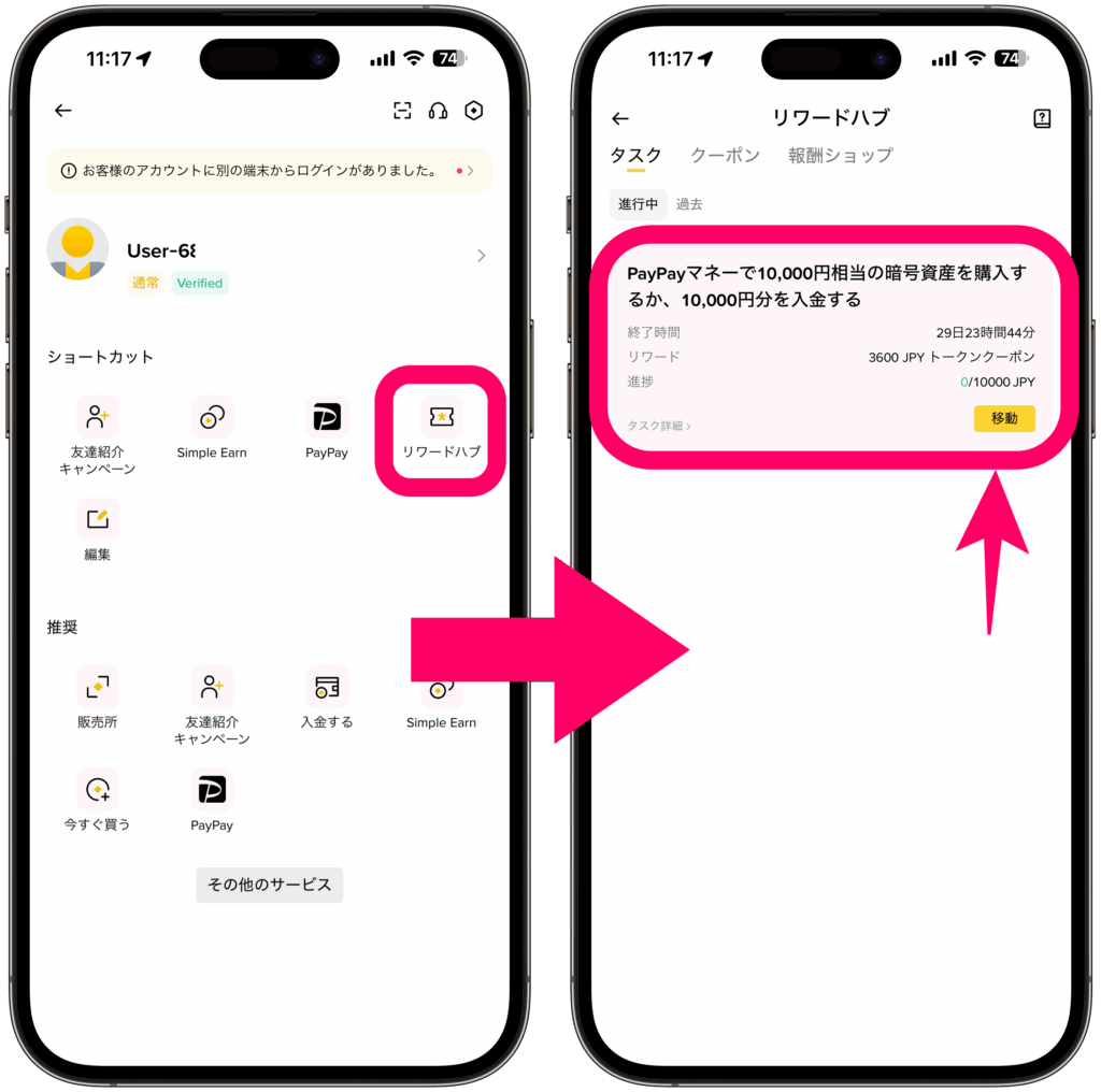 アプリ左上の「三(メニュー)」から「リワードハブ」を開き、該当キャンペーンのタスク画面で「移動」をタップします。
