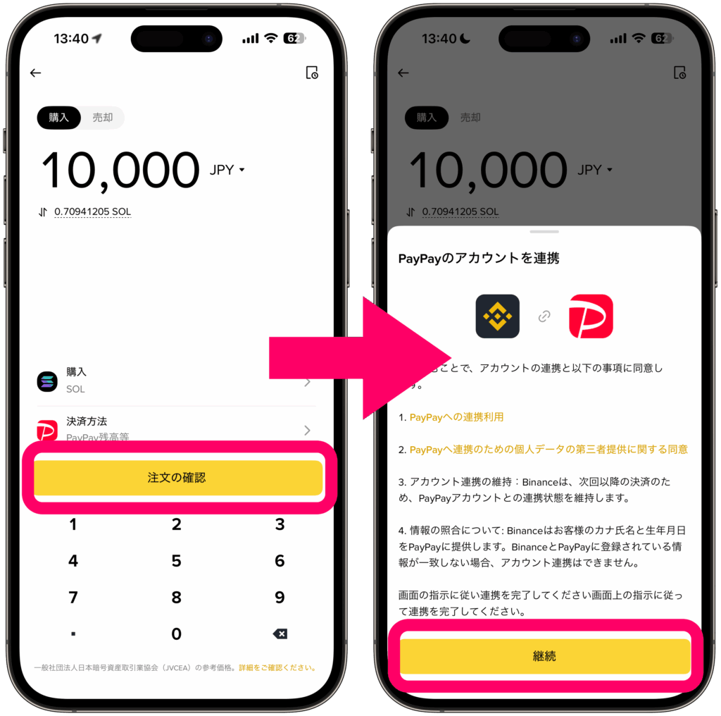 PayPayで入金すると自動的に暗号資産が購入されます(デフォルトはSOL)。SOLは取引スピードが極めて速く、流動性も高いため、購入から売却までの間に価格変動(スリップ)が起きるリスクを最小限に抑えられます。そのままSOLで購入を進めましょう。