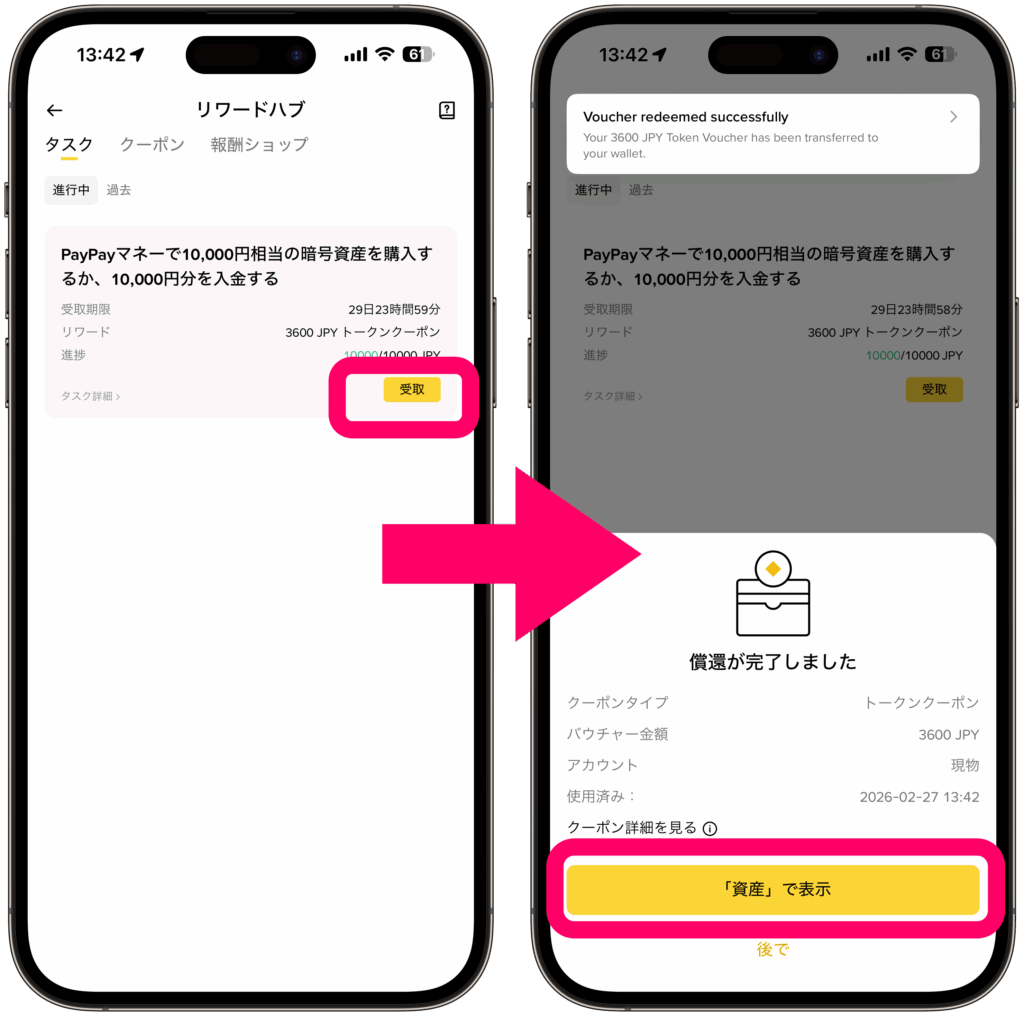 A. 条件(1万円分の入金・取引)をクリアした直後、リワードハブから即座に受け取り可能です。