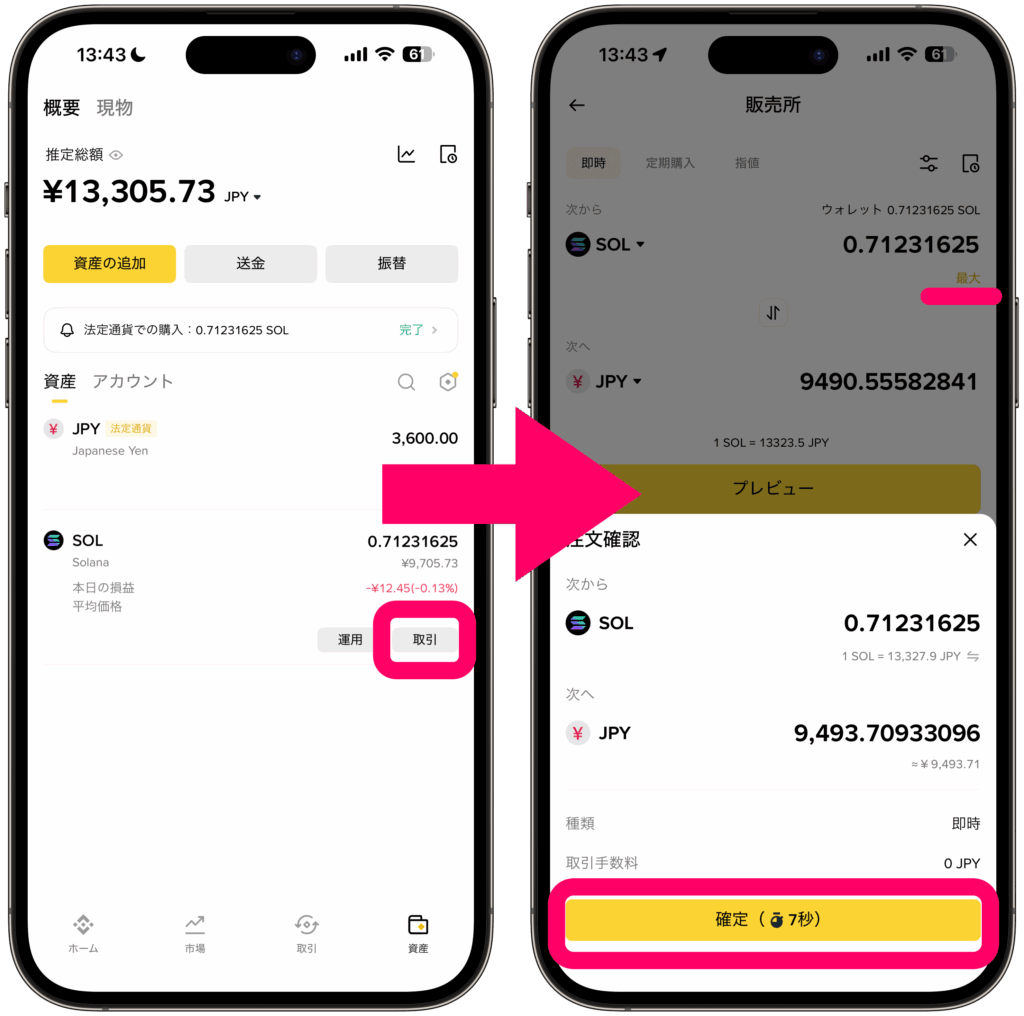 「資産」メニューからSOLを選び、「取引」→「最大」→「確定」の順にタップして、手持ちのSOLをすべてJPYに換金します。