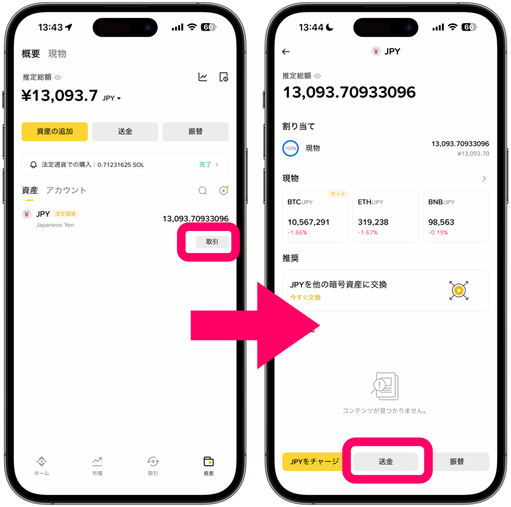 1. 「資産」タブのJPY(日本円)を選択し、「取引」→「送金」をタップ。