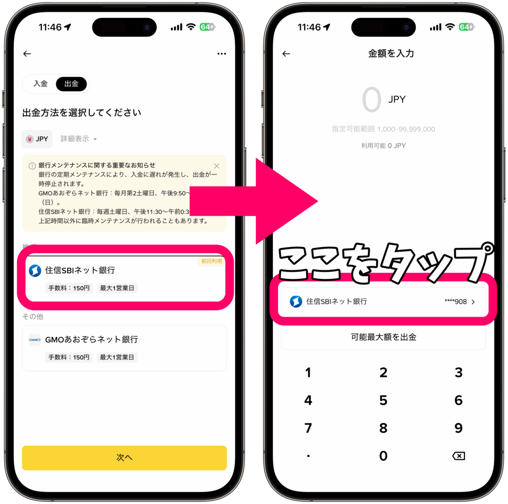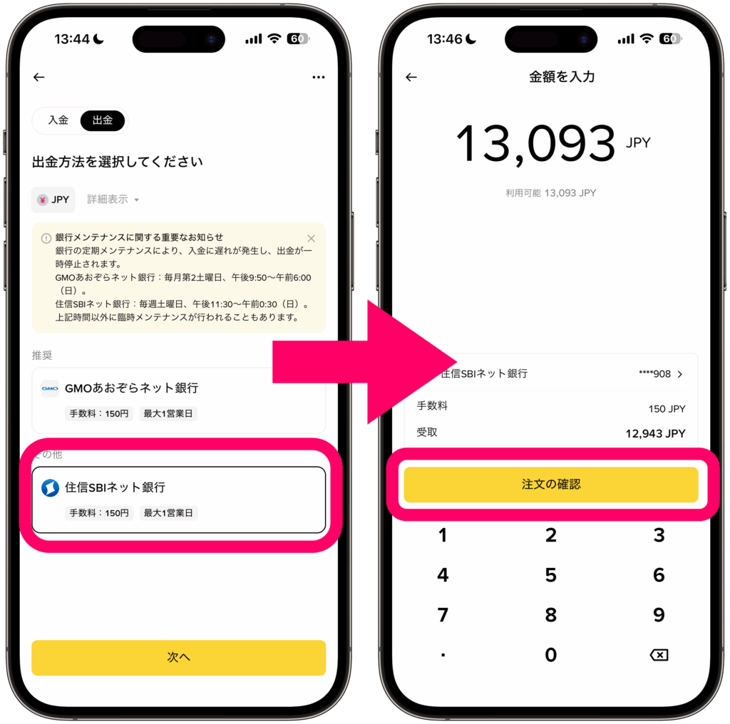 2. 出金先の銀行を選択し、金額を入力して「注文の確認」をタップします。