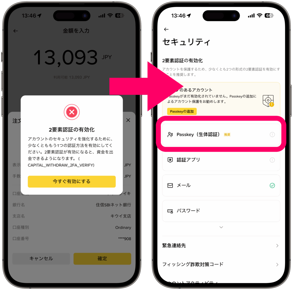 エラーメッセージが出たら画面の指示通りに2段階認証を設定し、再度出金申請しましょう!
