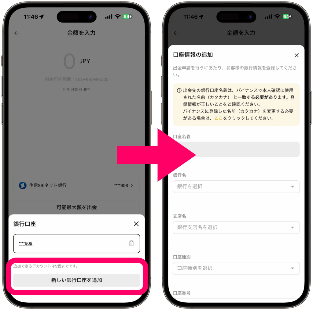 ② 「新しい銀行口座を追加」をタップし、あなたの所有している銀行口座を登録してください