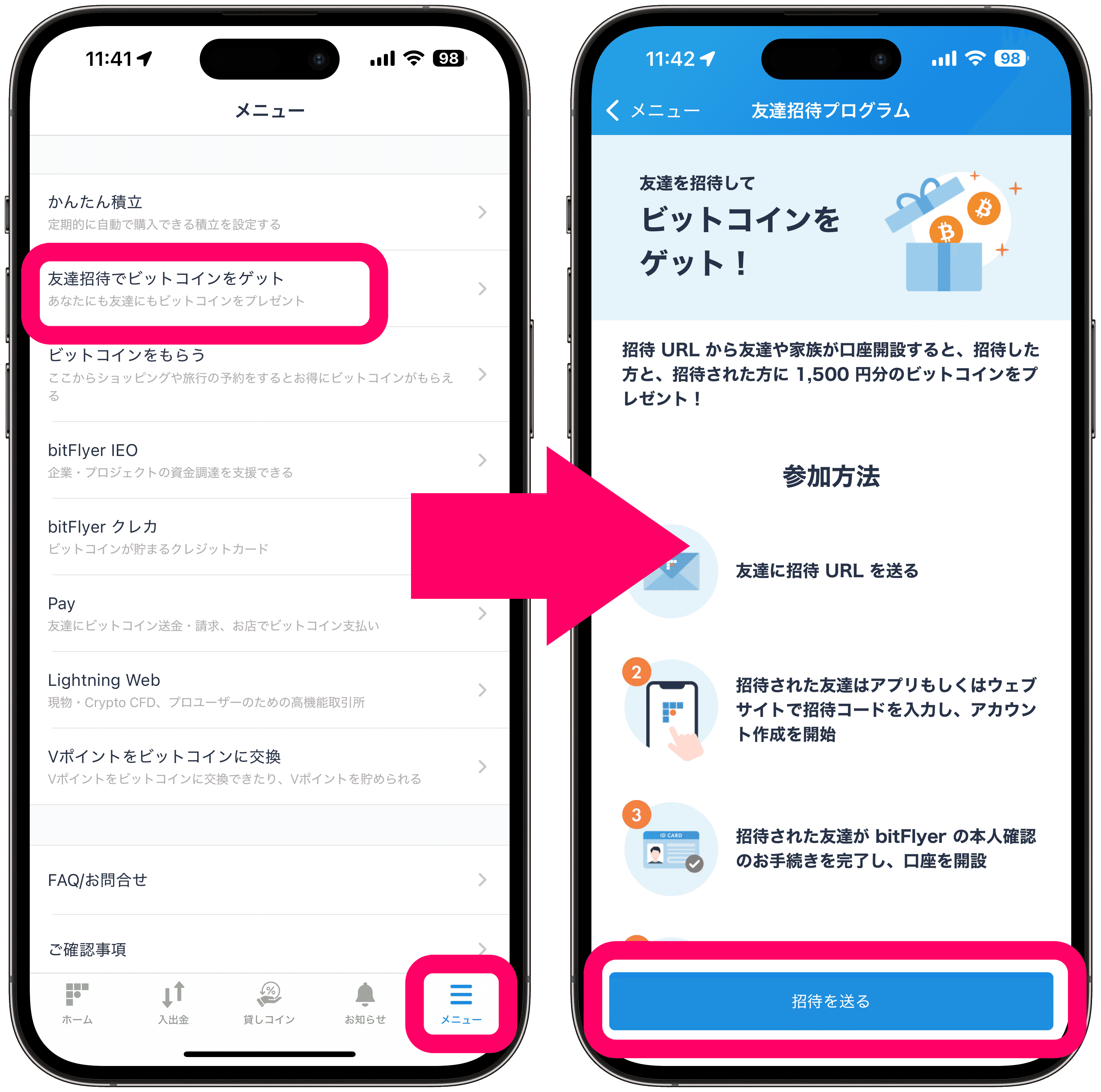 ビットフライヤーの招待制度は、アプリからの登録限定です。
